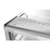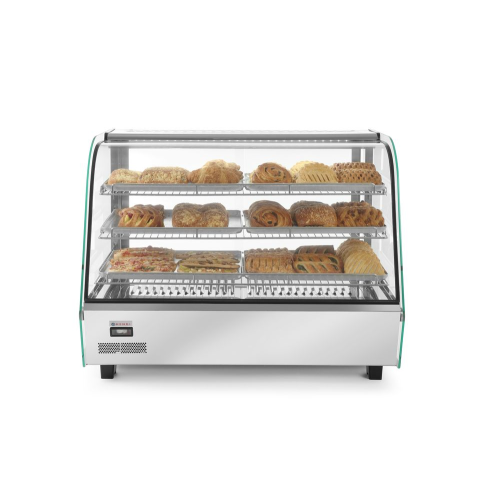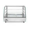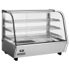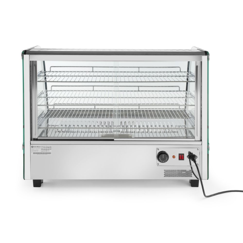 Uitgerust met enkele beglazing en gebogen glas aan de voorkant. Drie niveaus. Twee schuifdeuren aan de achterkant. Gemaakt van roestvast staal. LED-lampje aan de bovenkant van de kamer. Met 3 verchroomde verstelbare planken. Temperatuurregelknop en analoge thermometer. Temperatuurbereik: 30°-90°C.