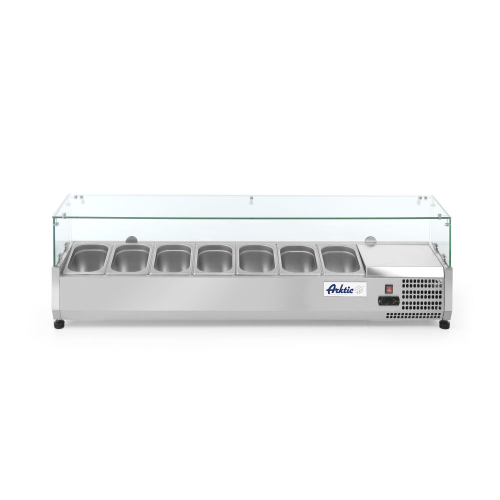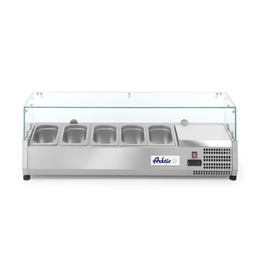 Met gehard glazen display. Koelvitrine voor GN 1/4 bakken met een maximale hoogte van 150 mm.
