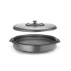 Aluminium met anti-aanbaklaag. Uitneembare thermostaat. Geschikt voor bakken, braden en warmhouden. Inclusief deksel met glazen kijkvenster en twee geïsoleerde grepen.