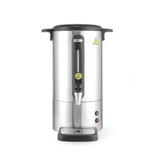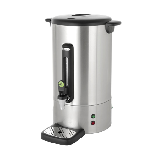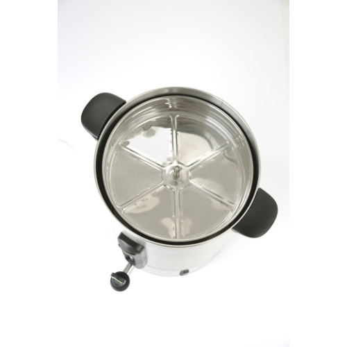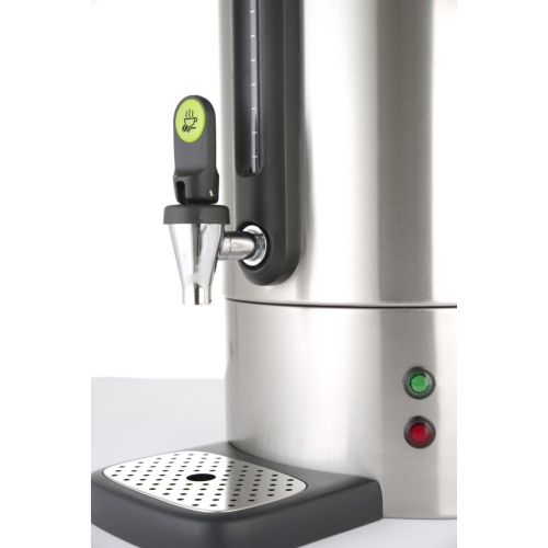 Ontworpen voor uw gasten door de gerenommeerde Nederlandse ontwerper Robert Bronwasser. Het unieke ontwerp met oog voor detail maakt dit apparaat een blikvanger op elk buffet. Behuizing van enkelwandig roestvast staal, met stijlvolle handgrepen en deksel van polypropyleen. Unieke non-drop kraan met geïntegreerd peilglas met maatverdeling. Magnetisch gekoppelde lekbak, kan verwijderd worden zonder tillen of morsen. Filterpan met ingebouwd filter voor grof gemalen koffie, hierdoor geen filterpapier nodig. De percolator houdt koffie op serveertemperatuur na het brouwen. Indicatielampje toont de voortgang van het brouwen en geeft aan wanneer ontkalking nodig is.