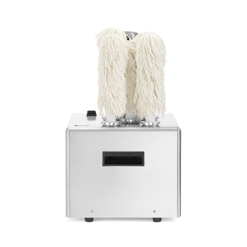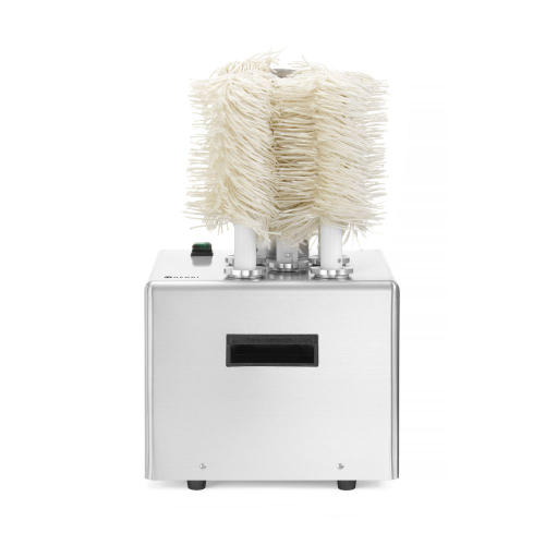 Behuizing gemaakt van roestvast staal. Borstels gemaakt van aluminium en POM, borstelharen gemaakt van microvezel. Poleer tot 330 glazen per uur, poleert en droogt tegelijkertijd. Inclusief: 4 borstels van 220 mm lang en 1 borstel van 190 mm lang. De borstels zijn niet vaatwasmachinebestendig.