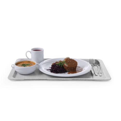 Gemaakt van polyesterlaminaat (glasvezel, hars). Granieten kleur en patroon. Stapelbaar, met ruimte tussen de trays om de luchtcirculatie te behouden. Temperatuurbestendigheid: -10-120 °C. Vaatwasmachinebestendig.