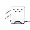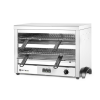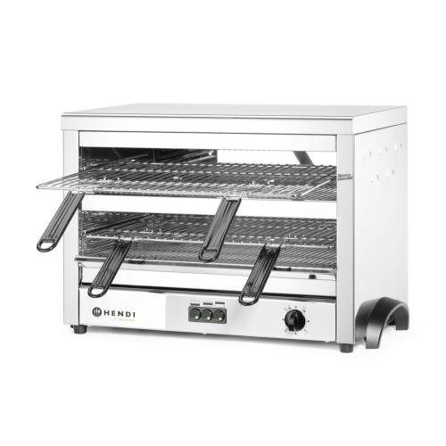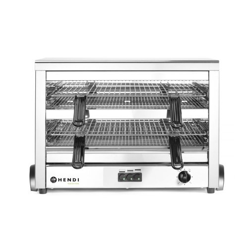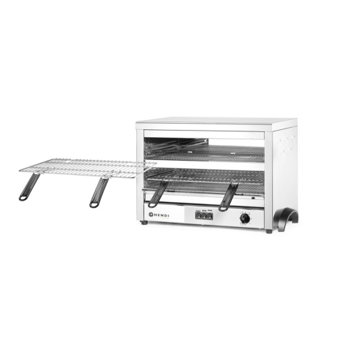 Met 9 kwartsverwarmingselement voor sneller opwarmen, grillen en gratineren van voedsel. Stalen roosters beschermen de elementen tegen beschadiging. Roestvaststalen behuizing. Met twee verchroomde roosters van 530x340 mm met elk twee afneembare handgrepen. Twee posities voor elk rooster met een afstand van 70 en 45 mm. Roestvaststalen kruimellade. Uitgerust met 3 zones met elk 3 elementen, per zone in te schakelen. Met 15 minuten timer, ook continu gebruik in te stellen. 1,3 m voedingskabel zonder stekker; een elektricien is nodig om het apparaat aan te sluiten.