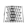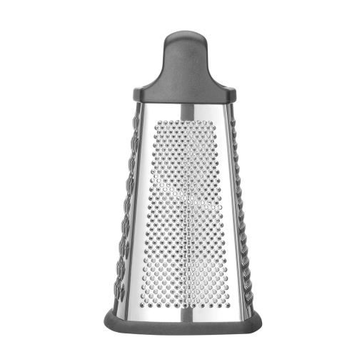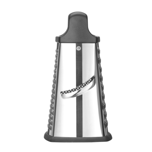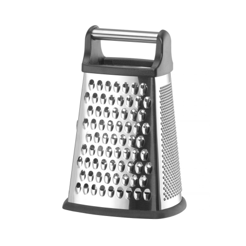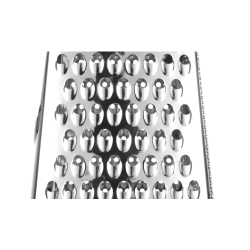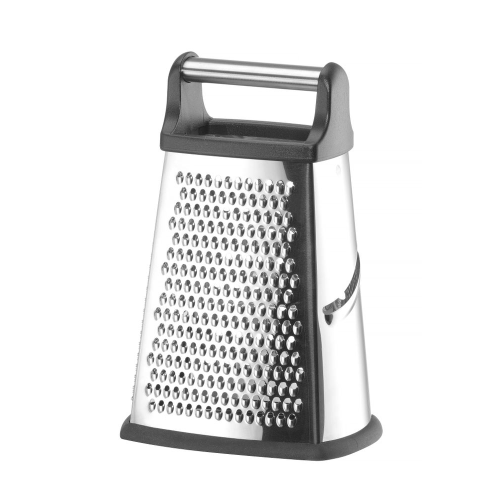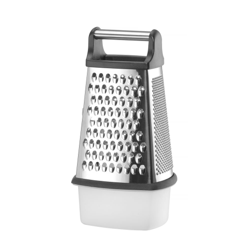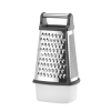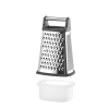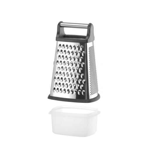 Gemaakt van roestvast staal, met ABS-handgreep en antislipbasis. Verzamelcontainer gemaakt van PP. 4 verschillende zijden: fijn, medium, grof en snijden. Vaatwasmachinebestendig.