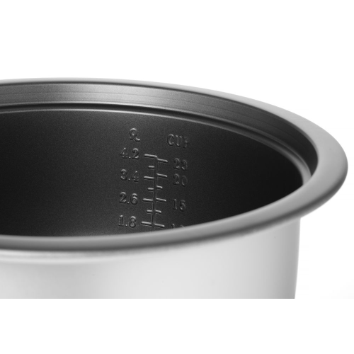 Gemaakt van duurzaam aluminium, gemakkelijk schoon te maken. Binnenkant is afgewerkt met een anti-aanbakcoating. Kookt rijst zonder moeite tot in perfectie, schakelt automatisch over naar warmhoudmodus na het koken. Ruime inhoud voor 4,2 liter of 23 maatbekers droge rijst. De handgrepen hebben een speciaal ontwerp, waardoor ze als dekselhouder kunnen dienen. Zo kun je een heet deksel veilig bewaren en heb je het deksel altijd bij de hand. Inclusief maatbeker (180 ml) en rijstlepel.