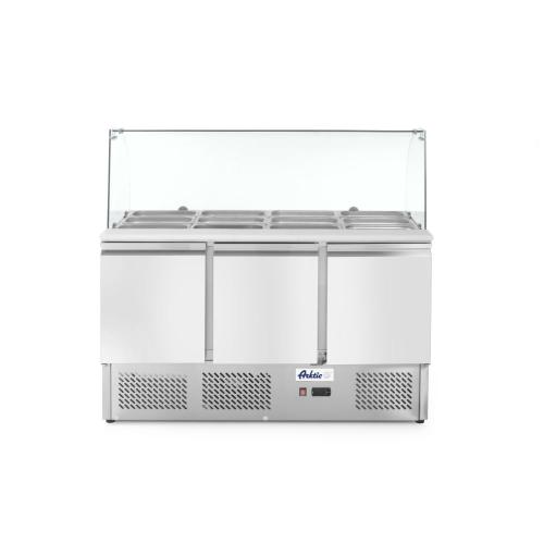 Met stijlvolle glazen vitrine welke toegang biedt tot ruimte voor 4x GN 1/1 bakken met een maximale hoogte van 150 mm. Koelruimte afmetingen: 1295x595x(H)500 mm. Inclusief 3 schappen (335x570 mm). Maximum capaciteit 15 kg per stuk (bij gelijkmatige verdeling van het gewicht). Plastic werkblad:1365x135x(H)20 mm. Gewicht: 110 kg.