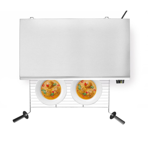 Gemaakt van roestvast staal. Mogelijkheid om een GN 1/1 tray in de kamer te plaatsen (niet inbegrepen in de set). Verwarmingselement bovenin de kamer. Mogelijkheid om het rooster op 4 verschillende niveaus te plaatsen. Wandmontage zonder extra beugels. Uitgerust met een thermostaat, een 30 minuten timer en een indicatielampje. Traploze temperatuur regeling – zorgt voor een nauwkeurige instelling. Temperatuurbereik: 50-300°C. Beschermingsgraad (IP): IPX4 – bescherming tegen waterspatten. Geschikt voor GN 1/1 containers tot 100 mm diep. Accessoires inbegrepen in de set: – rooster met 2 geïsoleerde grepen, – kruimellade.