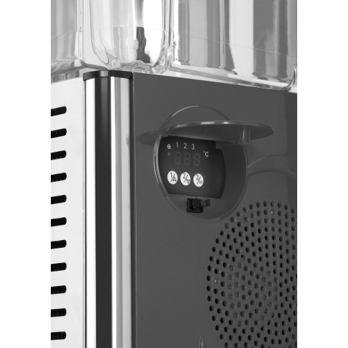 Behuizing en deksel gemaakt van ABS. Drankencontainers gemaakt van BPA-vrij Tritan. Instelbare temperatuur van 2°C tot 8°C. Elke container heeft een inhoud van 12 liter. Elk drankcontainer heeft een eigen temperatuurregeling en is uitneembaar voor eenvoudige reiniging. Het magnetische roersysteem mengt de sapinhoud gelijkmatig en houdt deze constant vers. Inclusief lekbak.