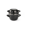 Zwart geëmailleerd. Omgekraalde roestvast stalen rand.