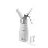 Aluminium kop, witte aluminium fles en patroonhouder. Met set van 3 polypropyleen spuitmondjes en schoonmaakborsteltje. Niet geschikt voor hete sauzen. Slagroompatronen (N₂O) vereist voor gebruik, niet inbegrepen.
