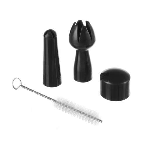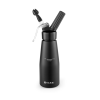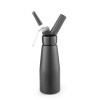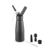 Mat zwart gecoate aluminium fles, kop en patroonhouder. Met set van 3 polypropyleen spuitmondjes en schoonmaakborsteltje. Niet geschikt voor hete sauzen. Slagroompatronen (N₂O) vereist voor gebruik, niet inbegrepen.