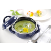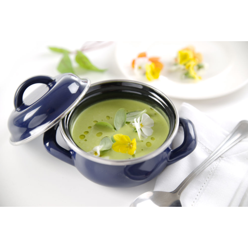 Geëmailleerd. Omgekraalde roestvast stalen rand.