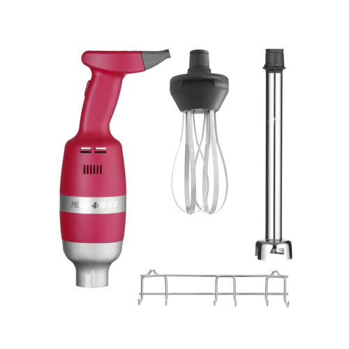 Professionele uitvoering. Behuizing van met glasvezel versterkt Polyamide (PA66). Roestvaststalen staaf en mes. Eenvoudig te reinigen. Met garde opzetstuk en opbergrek met muurbevestiging. Elektronisch bedieningspaneel. Snelheid in 9 stappen instelbaar tussen 2000 en 9000 tpm. Capaciteit tot 80 liter. Schacht lengte: 400 mm. Gewicht: 4,75 kg.