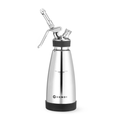 Gemaakt van dubbelwandig roestvast staal. Antislip silicone basisring. Sifon is geschikt voor zowel warme als koude sauzen. Inclusief 3 verschillende roestvaststalen mondstukken, een gasdop en een reinigingsborstel. Geschikt voor gebruik met HENDI slagroompatronen 588208, 588215, 586907 (niet inbegrepen). Vaatwasmachinebestendig.