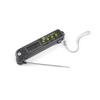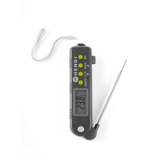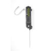 Meetbereik –50°C tot 300°C. Eenheid instelbaar °C of °F. Schaalverdeling 0,1°C, nauwkeurigheid 1°C tussen 0° en 100°C. “Hold” functie om de gemeten temperatuur vast te houden op het scherm. Min/Max temperatuur functie. Inklapbare roestvast stalen sonde 110 mm lang. Schakelt automatisch uit na 60 minuten. Batterij inbegrepen.