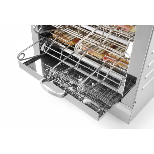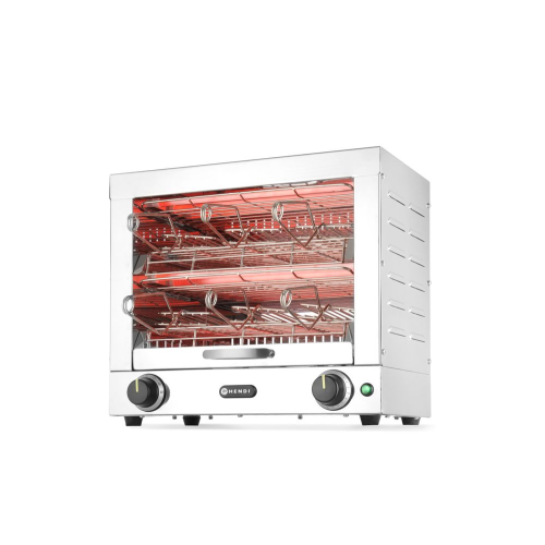 Tosti-apparaat met 2 lagen en 6 tostiklemmen - roestvast staal. Infrarood kwartsbuizen voor snelle verwarming, de maximale temperatuur kan binnen 30 seconden bereikt worden. De buizen zijn binnen enkele seconden weer afgekoeld. Schakelaar voor het selecteren van de verschillende warmteprogramma’s. Mechanische timer van 15 minuten met belletje. 6 tostiklemmen inbegrepen.