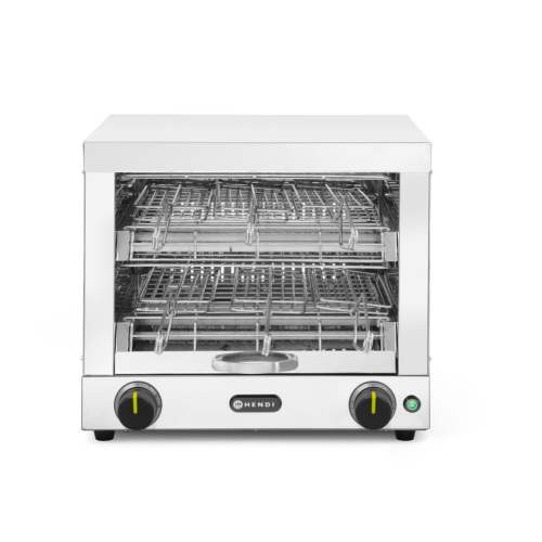 Tosti-apparaat met 2 lagen en 6 tostiklemmen - roestvast staal. Infrarood kwartsbuizen voor snelle verwarming, de maximale temperatuur kan binnen 30 seconden bereikt worden. De buizen zijn binnen enkele seconden weer afgekoeld. Schakelaar voor het selecteren van de verschillende warmteprogramma’s. Mechanische timer van 15 minuten met belletje. 6 tostiklemmen inbegrepen.