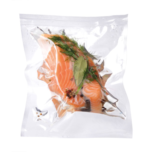 Speciaal voor gebruik in combinatie met het sous vide systeem. 2-laags zakken. Binnenlaag van Polyethyleen is geschikt voor contact met voedsel en is 60 µm. Buitenlaag van Polyamide (Nylon) is 15 µm. Totale dikte 75 μm. De gebruikte materialen fungeren als een UV-filter. De zakken kunnen worden gebruikt bij temperaturen van -20˚ tot 110˚C. Geschikt voor vacuümkamerverpakkingsmachines.