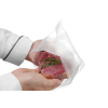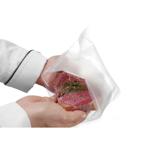 2-laags, binnenlaag 60 μm contact met levensmiddelen goedgekeurd Polyethyleen, buitenlaag 15 μm Polyamide (nylon). Totale dikte is 75 μm. De gebruikte materialen fungeren als een UV-filter. Het reliëf verbetert de luchtstroom uit de zak tijdens het vacuümverpakkingsproces. Zakken kunnen worden gebruikt bij temperaturen van -20˚ tot 100˚C. Geschikt voor kamer- en externe vacuümverpakkingsmachines.