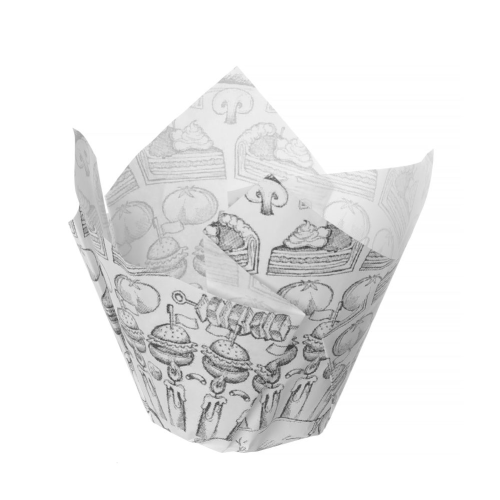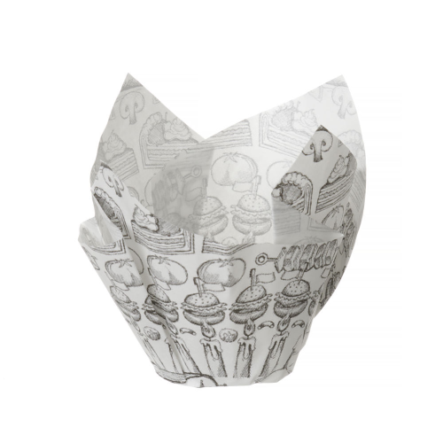 Voorgevormd als een mandje. Met patroon van illustratie van een kok met voedsel. Verpakt per 150 stuks.