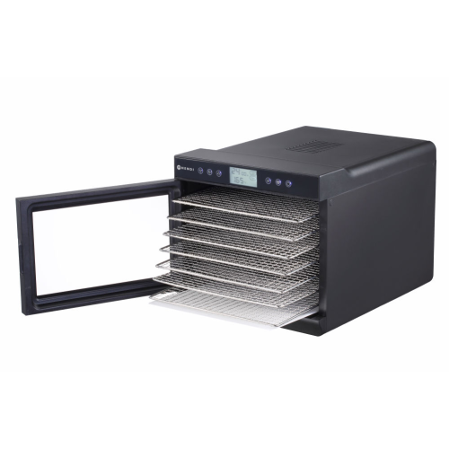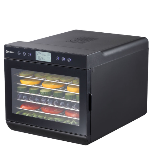 Voor het uitdrogen van fruit, groenten, kruiden, vlees, vis, enz. De automatische ventilator circuleert de warme lucht in de kamer, waardoor een gelijkmatige uitdroging wordt gegarandeerd zonder de roosters gedraaid hoeven te worden. De set bevat 7 roestvast stalen roosters van 305x330 mm, elk met een maximale belasting van 500 g. Roosters zijn gelijkmatig verdeeld in de kamer op 35 mm afstand, roosters zijn eenvoudig te verwijderen en te reinigen. Dubbelwandige polypropyleen behuizing verhoogt de thermische efficiëntie. Door de transparante deur kan het droogproces geobserveerd worden. Wordt geleverd met een transparant kruimel tray om te voorkomen dat kleinere vruchten vallen tijdens het drogingsproces – het kan ook op de bodem van de droogkamer worden geplaatst om resten op te vangen. Digitaal display. Temperatuurregeling: 35-70°C.Timer kan tot 24 uur worden ingesteld, met intervallen van 30 minuten.