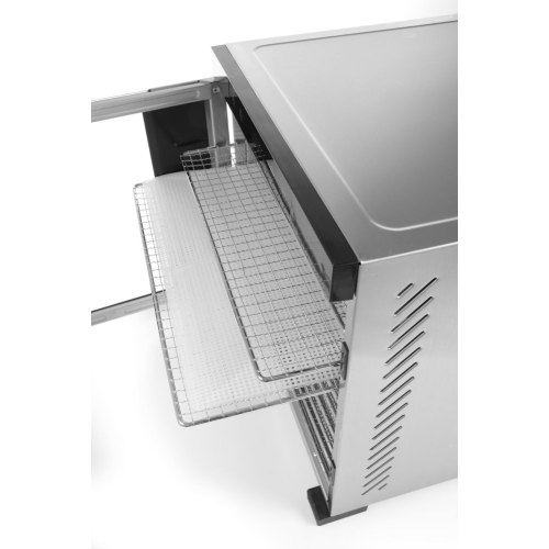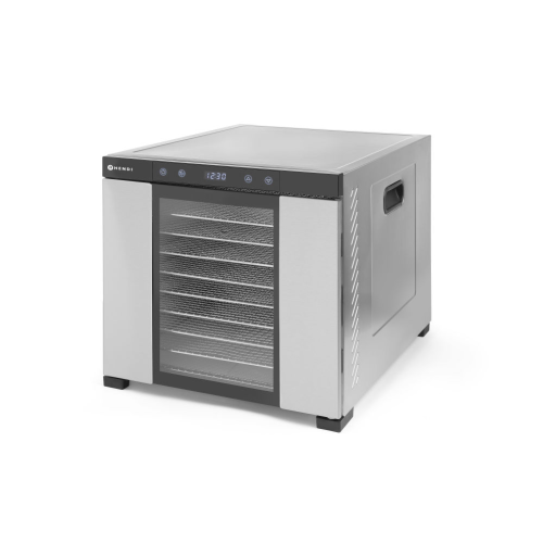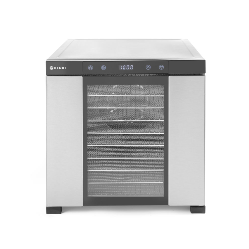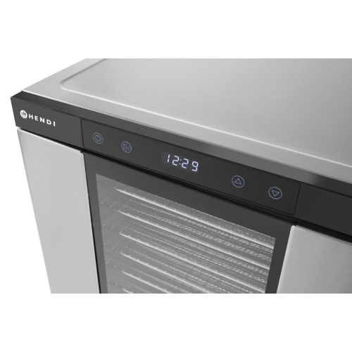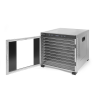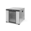 Roestvast stalen behuizing. Voor het drogen van fruit, groenten, kruiden, vlees, vis, etc. Met digitaal controlepaneel. Tijd instelbaar tot 24 uur in stappen van 30 minuten. Temperatuur instelbaar van 35°C tot en met 75°C in stappen van 5°. Extra stille motor zorgt voor een horizontale luchtstroom waardoor trays niet gedraaid hoeven te worden. Uitgerust met 10 roestvast stalen roosters van 395x380 mm. Roosters zijn gelijkmatig verdeeld en eenvoudig te verwijderen en reinigen. Eenvoudig te openen deur met zichtglas om het droogproces te kunnen observeren.