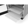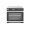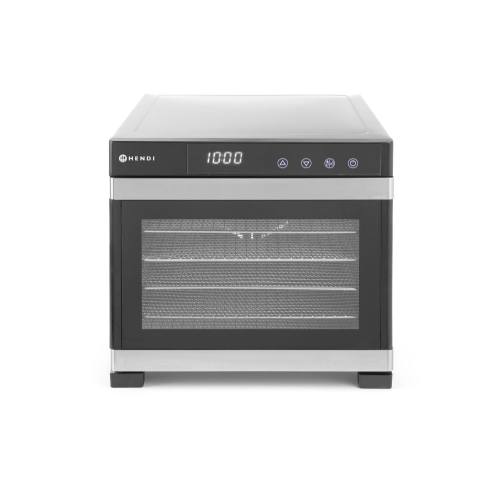Roestvast stalen behuizing. Voor het drogen van fruit, groenten, kruiden, vlees, vis, enz. Digitaal bedieningspaneel. Timer kan maximaal 24 uur worden ingesteld, met intervallen van 30 minuten. Temperatuurregeling: 35-75°C, instelbaar in stappen van 5°C. De stille ventilator circuleert de warme lucht in de kamer, waardoor een consistente droging wordt gegarandeerd zonder dat de roosters gedraaid hoeven te worden. De set bevat 6 roestvast stalen roosters van 305x330 mm. Roosters zijn gelijkmatig verdeeld, eenvoudig te verwijderen en te reinigen. Door de transparante deur kan het uitdrogingsproces worden geobserveerd.