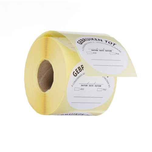 Ruimte voor datum, tijd en aanvullende opmerkingen. Aantal stickers per rol: 500. Label in 3 talen: Nederlands, Frans en Duits.