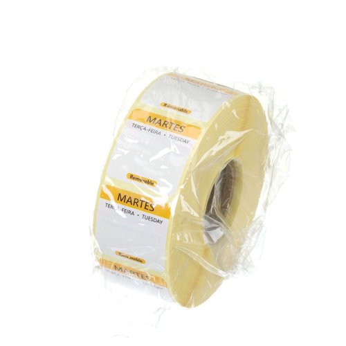 Ruimte voor het schrijven van de datum. Aantal stickers per rol: 1000. Elke dag van de week is gemarkeerd met een andere kleur. Label in 3 talen: Spaans, Portugees en Engels.