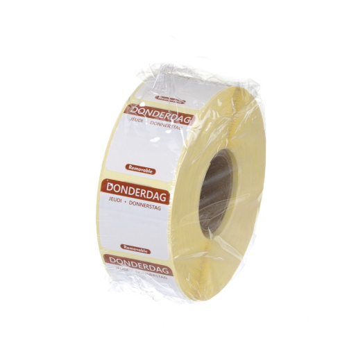 Ruimte voor het schrijven van de datum. Aantal stickers per rol: 1000. Elke dag van de week is gemarkeerd met een andere kleur. Label in 3 talen: Nederlands, Frans en Duits.