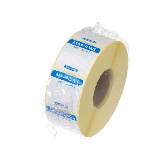 Ruimte voor het schrijven van de datum. Aantal stickers per rol: 1000. Elke dag van de week is gemarkeerd met een andere kleur. Label in 3 talen: Nederlands, Frans en Duits.