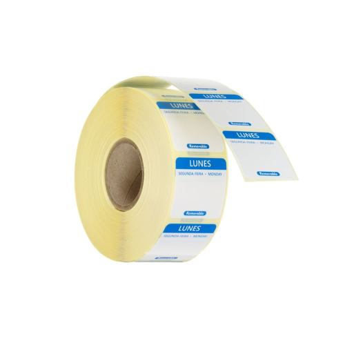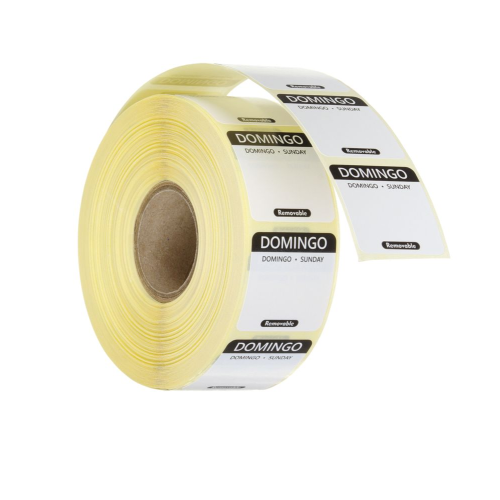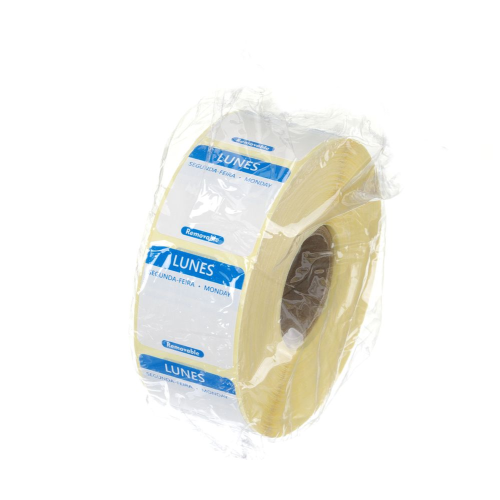Ruimte voor het schrijven van de datum. Aantal stickers per rol: 1000. Elke dag van de week is gemarkeerd met een andere kleur. Label in 3 talen: Spaans, Portugees en Engels.