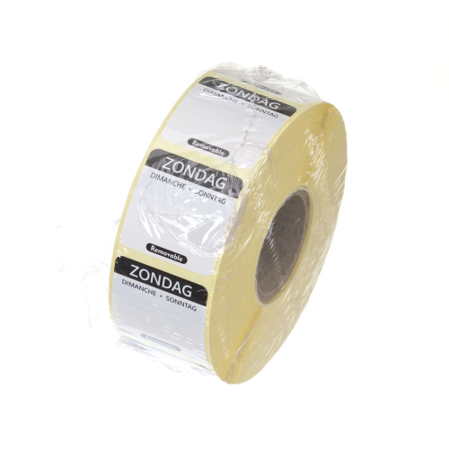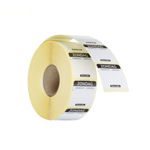 Ruimte voor het schrijven van de datum. Aantal stickers per rol: 1000. Elke dag van de week is gemarkeerd met een andere kleur. Label in 3 talen: Nederlands, Frans en Duits.