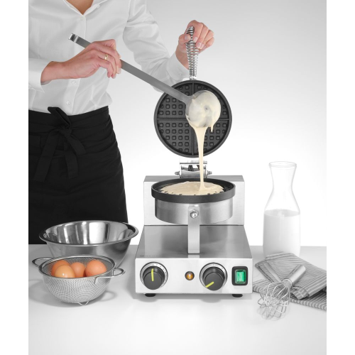 U kunt maximaal 20 wafels per uur maken. Het ronde wafelijzer is gemaakt van gegoten aluminium en voorzien van een duurzame Teflon® antiaanbaklaag. De wafels zijn ø190 mm en tot 23 mm dik. De temperatuur is traploos in te stellen tussen de 50˚C en 210˚C. De timer kan worden ingesteld tot 15 minuten.