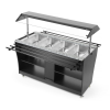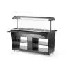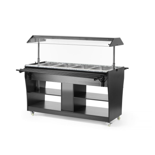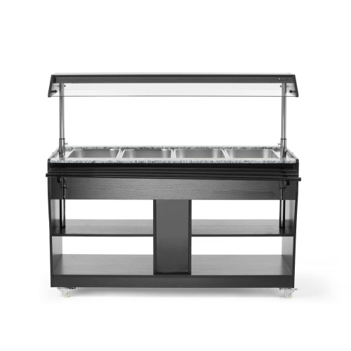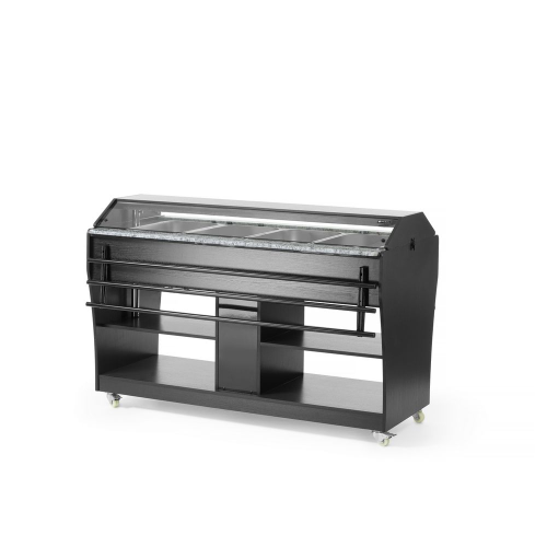 Behuizing gemaakt van roestvast staal met zwart multiplex. Geschikt voor 4 GN 1/1 containers – max. 150 mm diep. Geleverd met 4 GN 1/1 containers. Uitgerust met een lampje in de kap. De luifel kan worden neergelaten om als afdekking te fungeren, vastgezet met vergrendelingen. Inklapbare dienblad geleiders aan beide zijden. 2 planken onder de toonbank. Uitgerust met 4 zwenkwielen. Temperatuur instelbaar van 30°C tot 90°C.