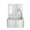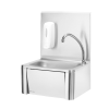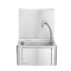 Zet het water op een hygiënische manier aan door simpelweg je knie tegen het voorpaneel te drukken. Voorzien van warm- en koudwatermengkraan welke zich onder het frontpaneel bevindt. Wastafel en achterwand gemaakt van 18/8 roestvast staal. Wordt geleverd met tuit en zeepdispenser. Afmetingen frontpaneel: 284x(H)183 mm. Afmetingen spoelbak: 335x235x(H)114 mm. Wateraansluiting: 1/2”, afvoergat Ø 50 mm.