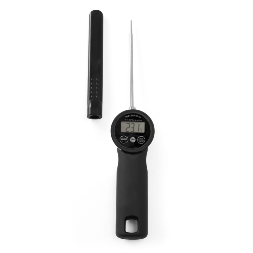 Waterdicht. Temperatuurbereik -50°C tot 300°C. Schaalverdeling 0.1°C tussen -19.9 en 199.9°C, voor overige temperaturen 1°C. Nauwkeurigheid 1°C tussen -20°C en 100°C, voor overige temperaturen ± 2°C. Vergrendel stand voor doorlopende temperatuurmeting. 120 mm roestvast stalen sonde. Meet de temperatuur in één seconde. Met beschermhoes en ergonomische handgreep. Schakelt automatisch uit na 10 minuten. Batterij inbegrepen.