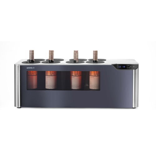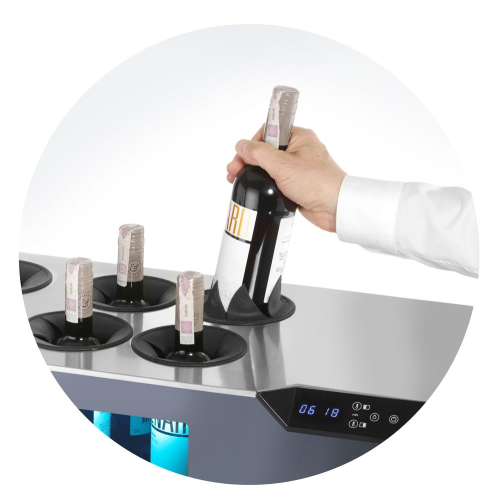 Gemaakt van roestvast staal. Wijnkoeler met twee temperatuurzones. Met touchscreenbediening. Onafhankelijk instelbare zones (3°C-18°C) houden rode en witte wijnen op de juiste serveertemperatuur. LED-verlichting in de kamer (keuze uit 3 kleuren: wit, amber, blauw). Capaciteit tot 8 flessen. Geschikt voor zowel geopende als gesloten flessen. Zorgt voor een consistente wijntemperatuur.