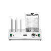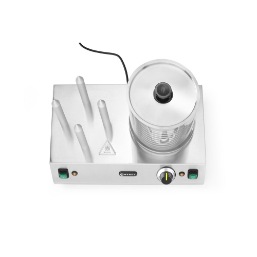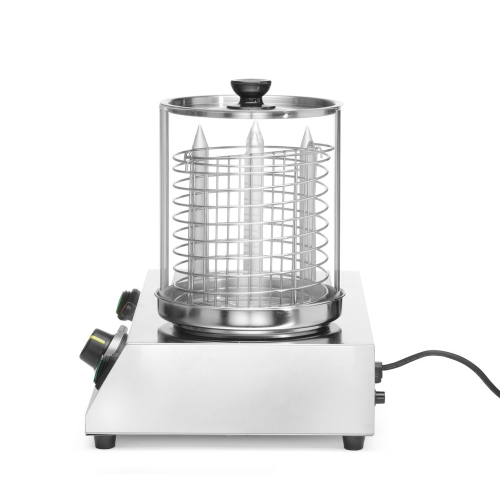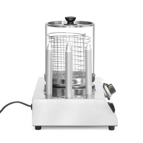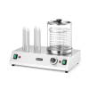 Behuizing, worstenhouder met verdeler en deksel van roestvast staal. Aluminium verwarmingsstaven voor broodjes, met afmetingen: Ø25x(L)198 mm. Beschermende container gemaakt van glas. Worstenhouder van ø175 mm, voor worstjes tot 24 cm lang. Capaciteit waterreservoir: 1 L Met verwarmingsindicatielampje. Bescherming tegen oververhitting. Temperatuur instelbaar met een draaiknop, van 20°C tot 100°C.