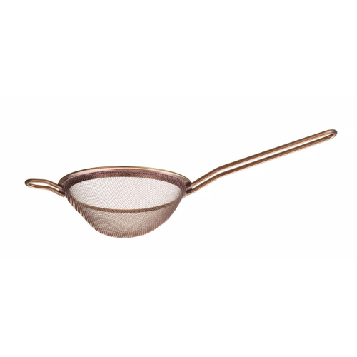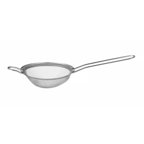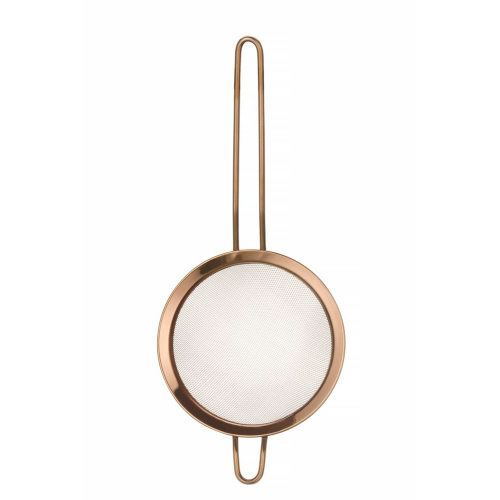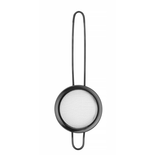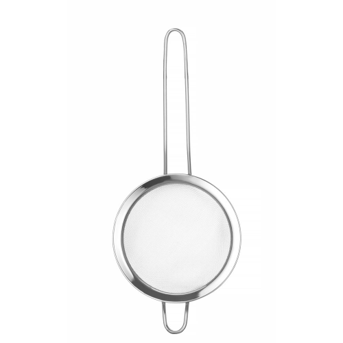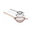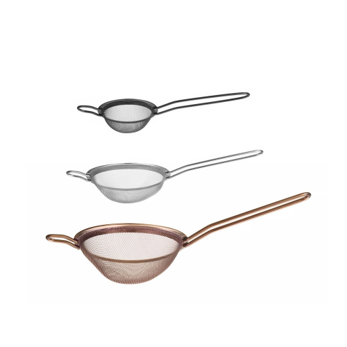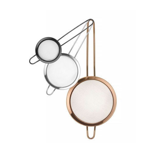 Gemaakt van gepoedercoat AISI204 roestvast staal. Met een kleine steun om de zeef op een pot of kom te plaatsen of op te hangen. Afmetingen: – zwartgekleurde zeef: -74 mm, (L)215 mm, (H)25 mm, – zilverkleurige zeef: -105 mm, (L)245 mm, (H)30 mm, - koperkleurige zeef: -144 mm, (L)337 mm, (H)45 mm. Lengte handgreep: – zwartkleurige zeef: 115 mm, – zilverkleurige zeef: 120 mm, – koperkleurige zeef: 165 mm. Mesh-maat: – zwartkleurige zeef: 1×1 mm, – zilverkleurige zeef: 1×1 mm, – koperkleurige zeef: 1,5×1,5 mm. Niet vaatwasmachinebestendig.