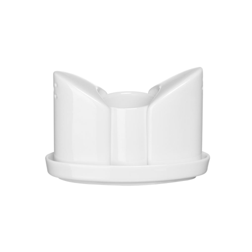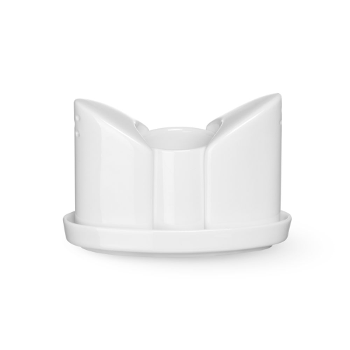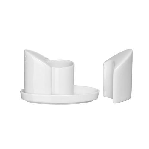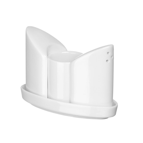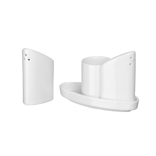 Gemaakt van porselein. 4-delig set bestaande uit een zoutvaatje, een pepervaatje, een tandenstokershouder en een dienblad, allemaal gemaakt van porselein.
